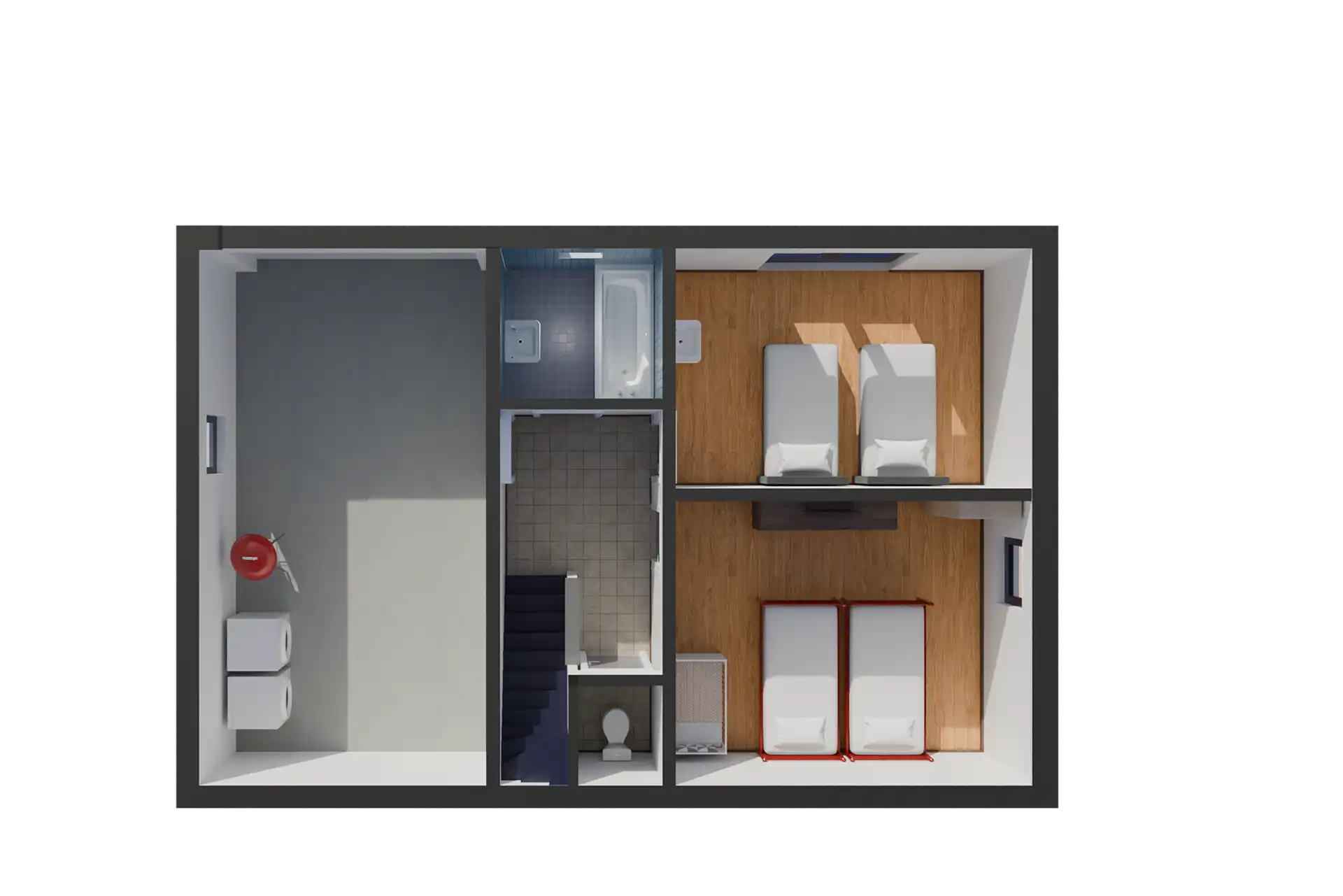 Das Haus hat alles, was Sie für einen erholsamen Urlaub benötigen. Das großzügige Wohnzimmer mit Kamin schafft eine gemütliche Atmosphäre zum gemeinsamen Genießen. Die offene Küche lädt zum Zubereiten köstlicher Mahlzeiten ein, während die vier Schlafzimmer – zwei im Obergeschoss und zwei im Erdgeschoss – für einen erholsamen Schlaf sorgen. Darüber hinaus gibt es zwei Badezimmer: im Obergeschoss mit Dusche, Waschbecken und WC und im Erdgeschoss mit Badewanne und Waschbecken. Es gibt einen separaten Toilettenraum im Flur im Erdgeschoss.