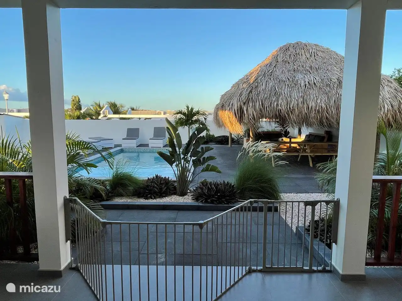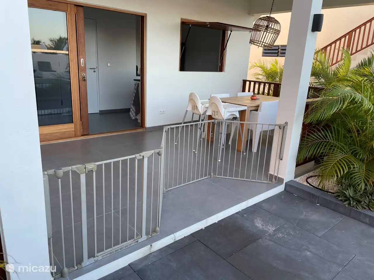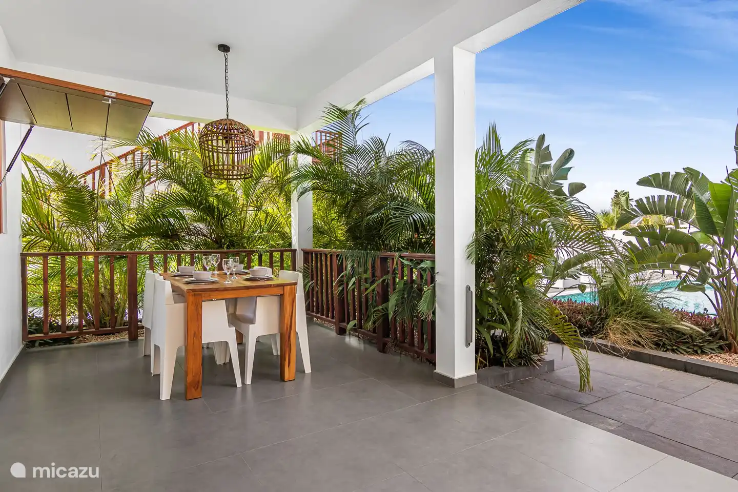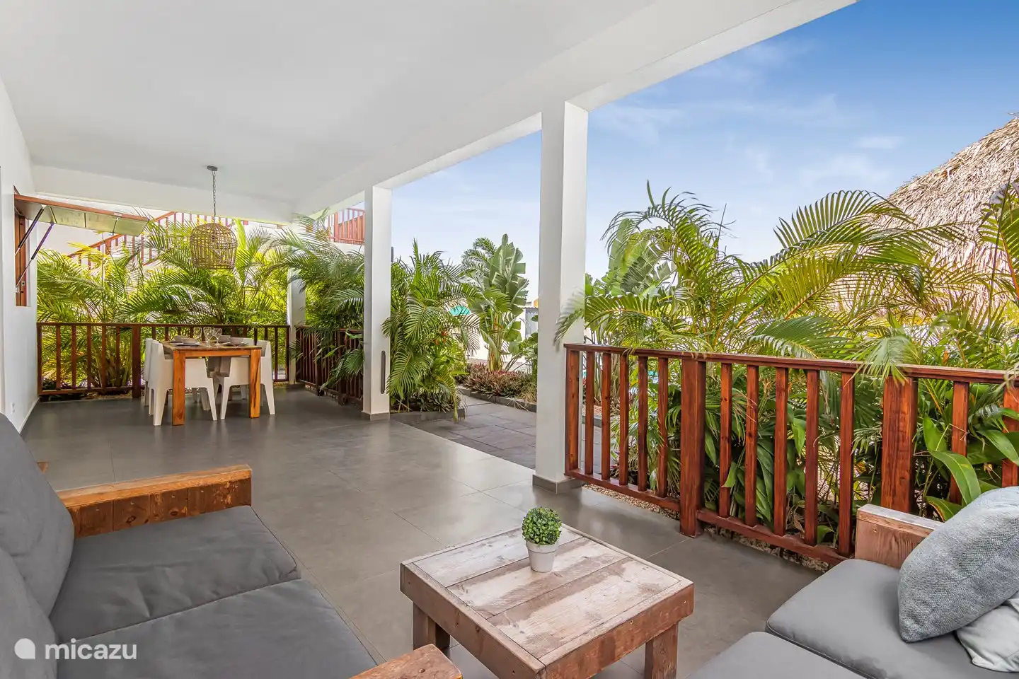 Durch eine Schiebetür kann man auf die großzügige private Terrasse gelangen. Hier können Sie das Lounge-Set oder am Esstisch genießen. Fast immer gibt es eine angenehme Brise, die für Kühlung sorgt. Von der privaten Terrasse aus hat man außerdem einen wunderschönen Blick auf den Karibikgarten mit schönen Palmen und dem Schwimmbad. Von der Terrasse beider oberen Wohnungen hat man einen herrlichen Blick auf die Umgebung und den Tafelberg.