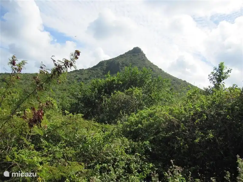 Sowohl vom Wohnzimmer als auch vom Schlafzimmer aus hat man durch zwei große französische Türen einen wunderschönen Blick auf den tropisch gestalteten Garten. Die Außenterrasse hat einen Beistelltisch, einen Esstisch mit 4 Stühlen und zwei Relaxsessel mit Fußschemel.