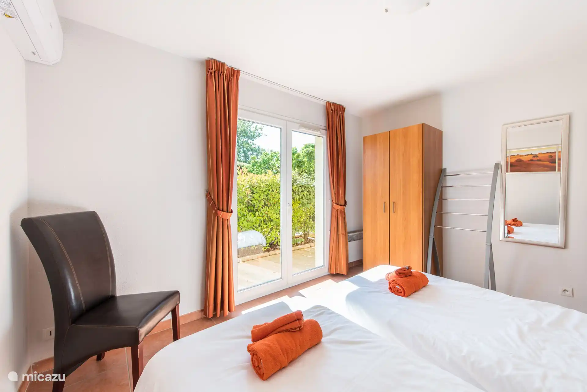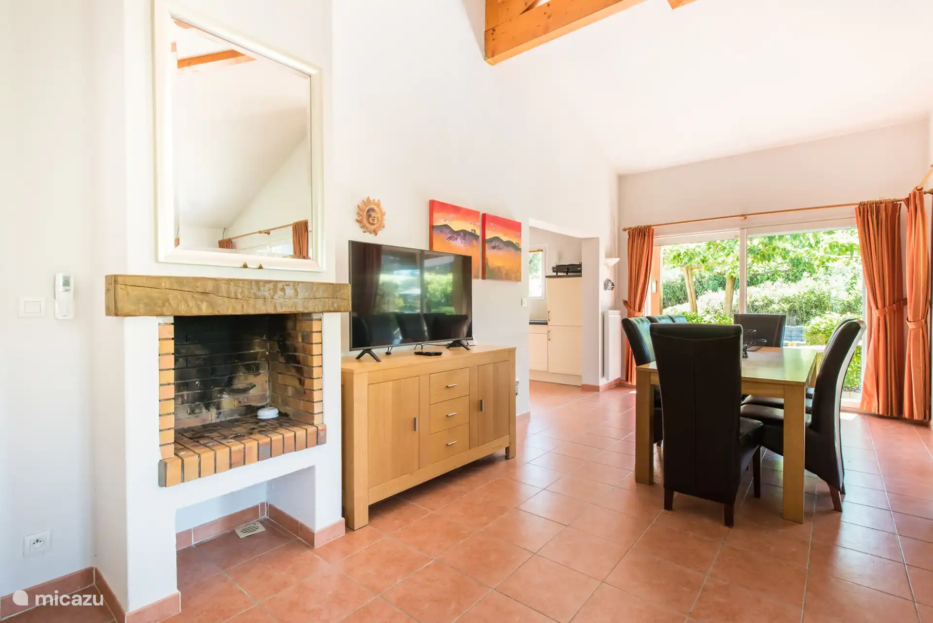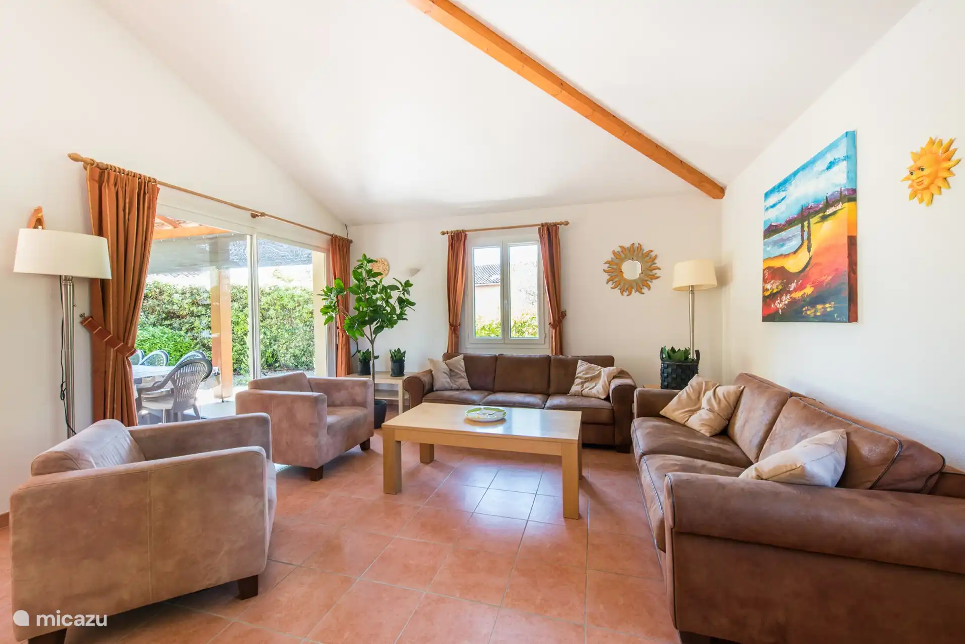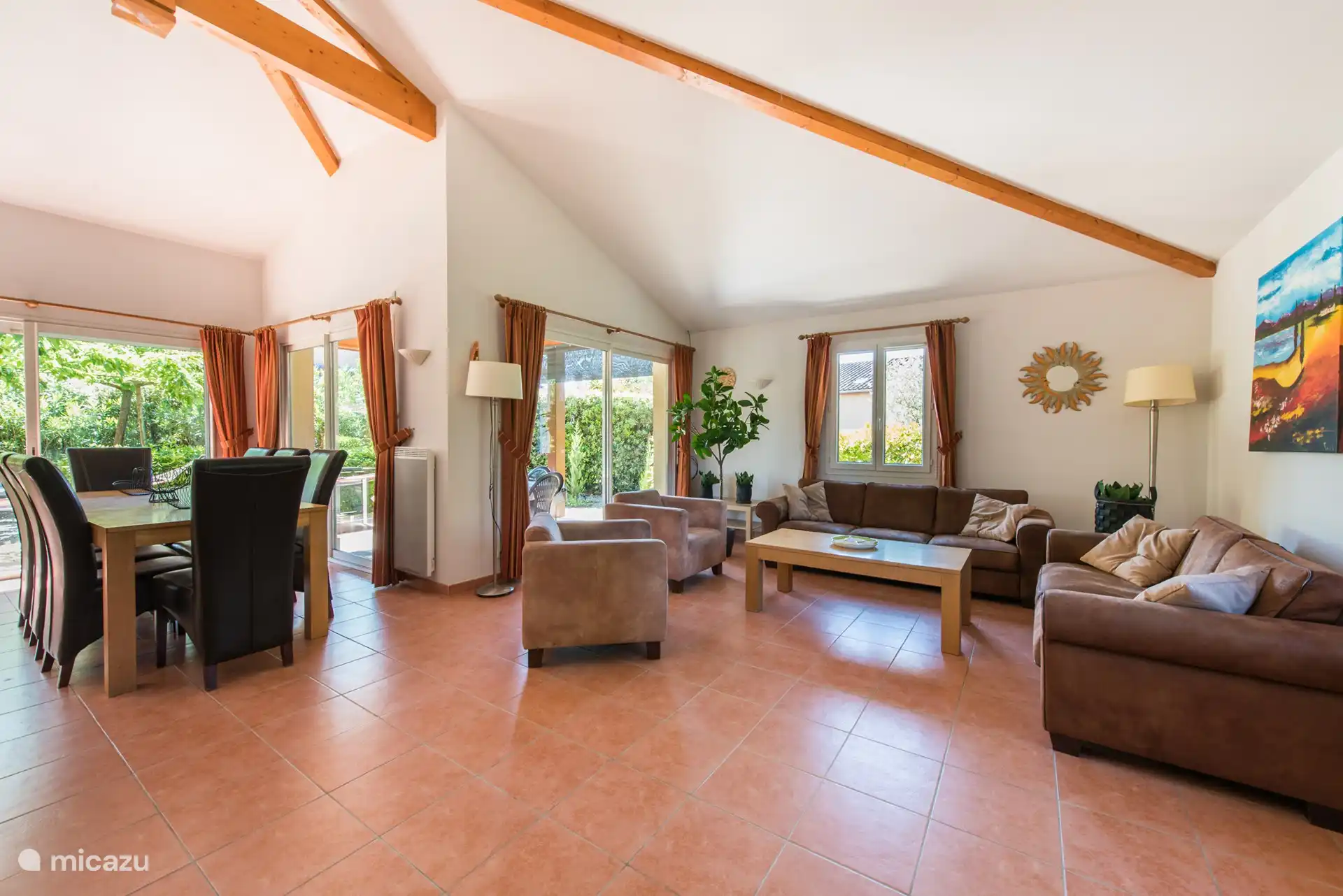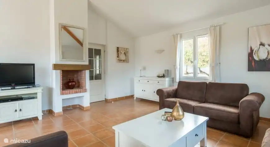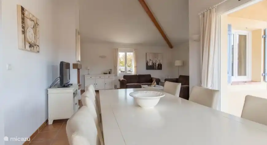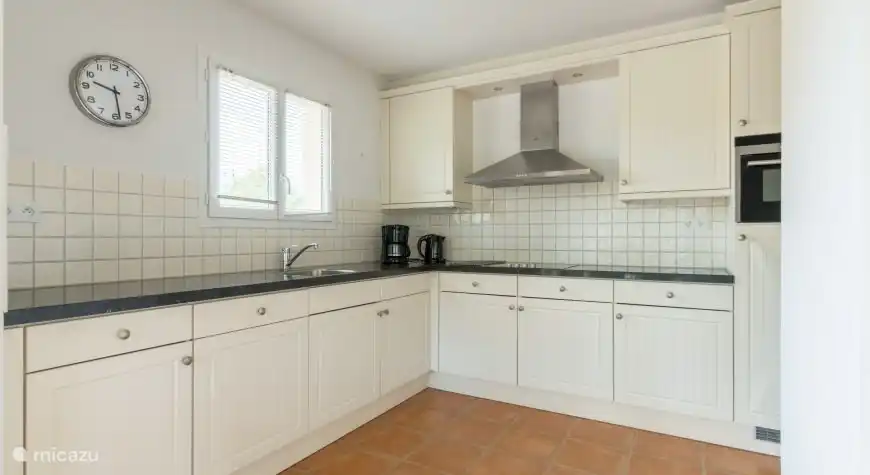 Geräumiges Wohnzimmer mit Sofas und Sesseln, Fernseher mit niederländischen Kanälen, unter anderem. Es gibt einen großen Essbereich mit Stühlen, eine offene Küche, die mit allen modernen Annehmlichkeiten ausgestattet ist, und eine Dolce Gusto-Kaffeemaschine. Eine Klimaanlage ist auch im Wohnzimmer vorhanden. Durch die Schiebetüren im Wohnzimmer gelangen Sie direkt auf die überdachte Terrasse in Richtung des privaten Swimmingpools. Darüber hinaus befinden sich im Erdgeschoss zwei Schlafzimmer mit Klimaanlage für zwei Personen und ein Badezimmer mit Badewanne und WC.