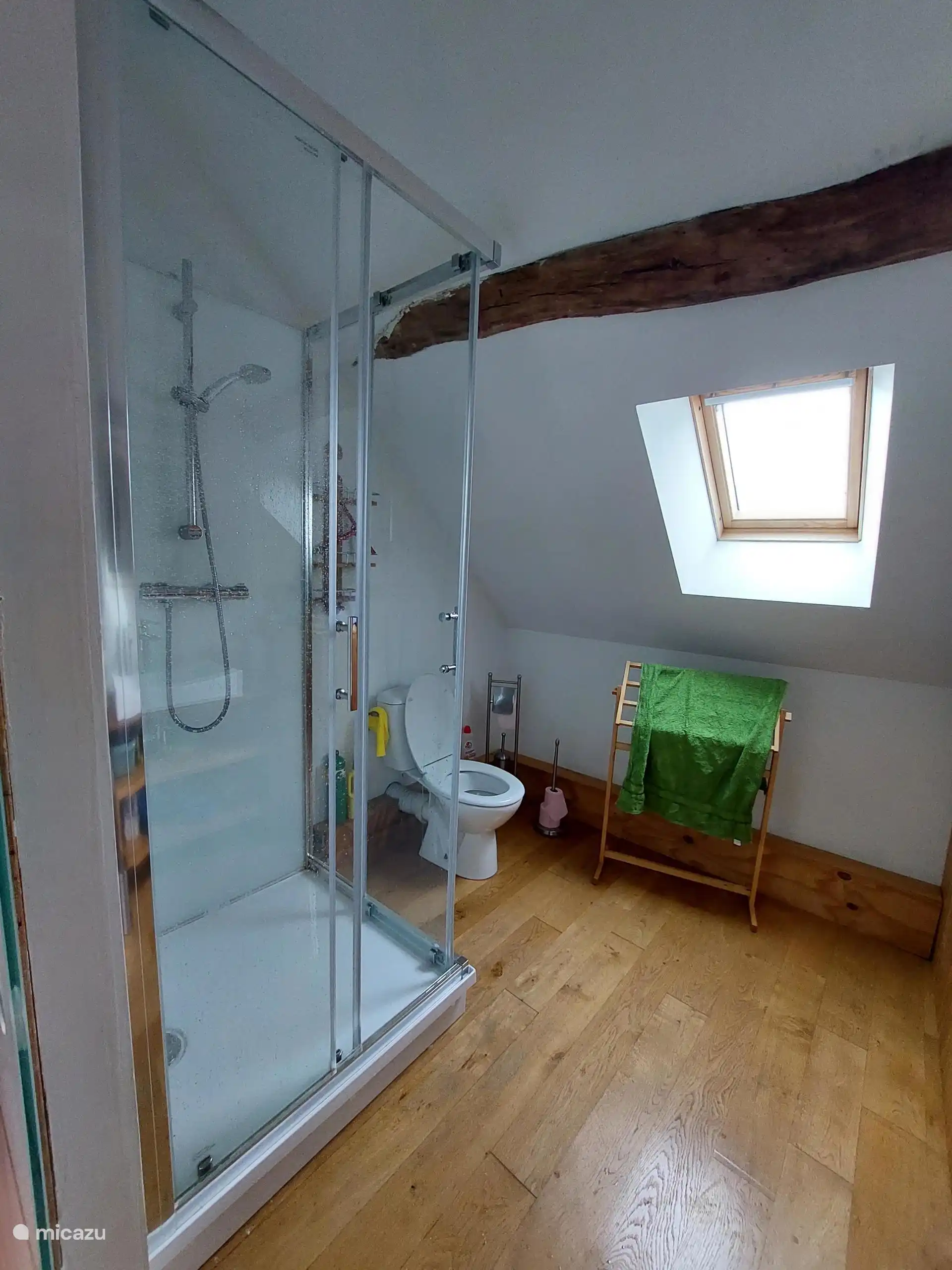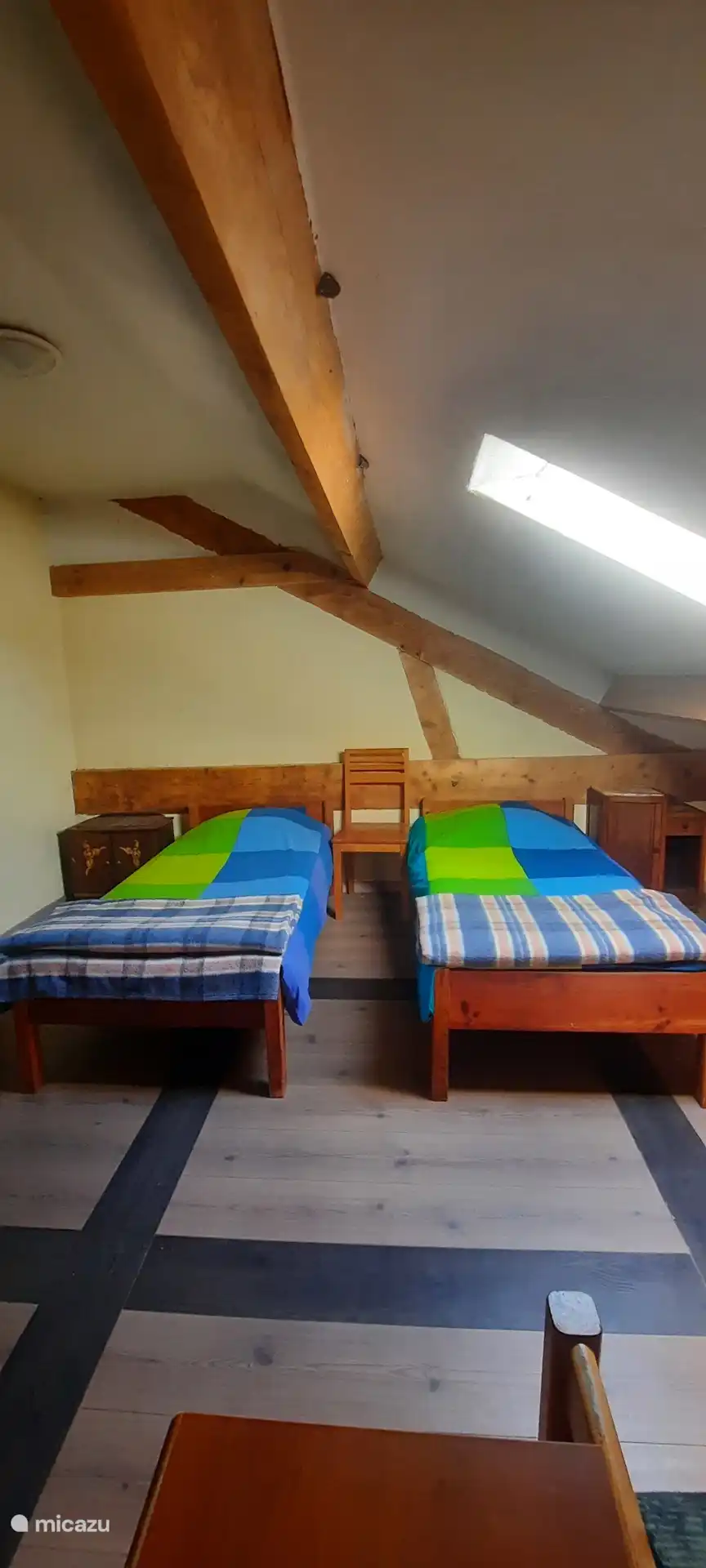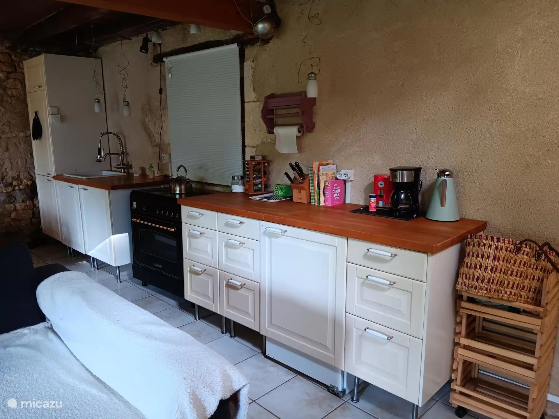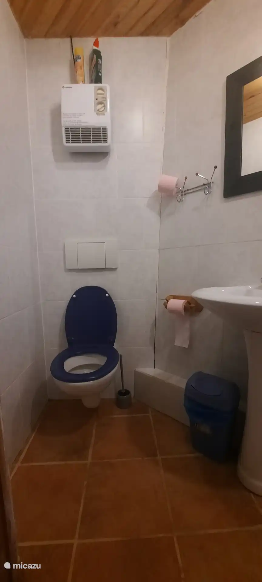 Beim Eintreten: im Erdgeschoss befindet sich eine Sitzecke mit gemütlichem Holzofen, eine Küche mit Kühlschrank und großem Gasherd plus Backofen, eine Essecke und ein Geschirrschrank. Über eine offene Treppe gelangt man in den ersten Stock. Diese Etage ist geräumig und es gibt ein Doppelbett und einen Schrank, in dem Bettdecken und Kissen zu finden sind, auch für das Schlafsofa im Erdgeschoss, praktisch, wenn Sie Gäste haben. Das Badezimmer befindet sich ebenfalls im ersten Stock mit Duschkabine, Waschbecken und WC.
