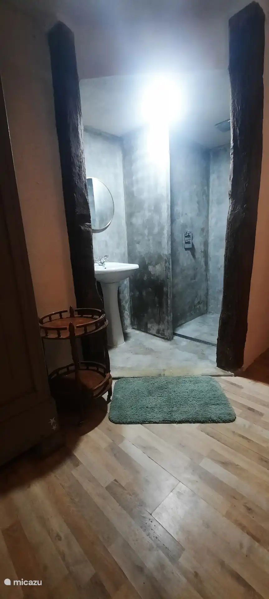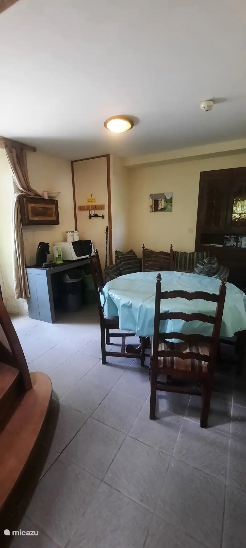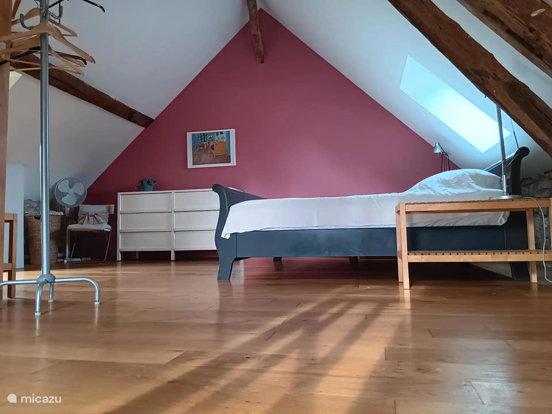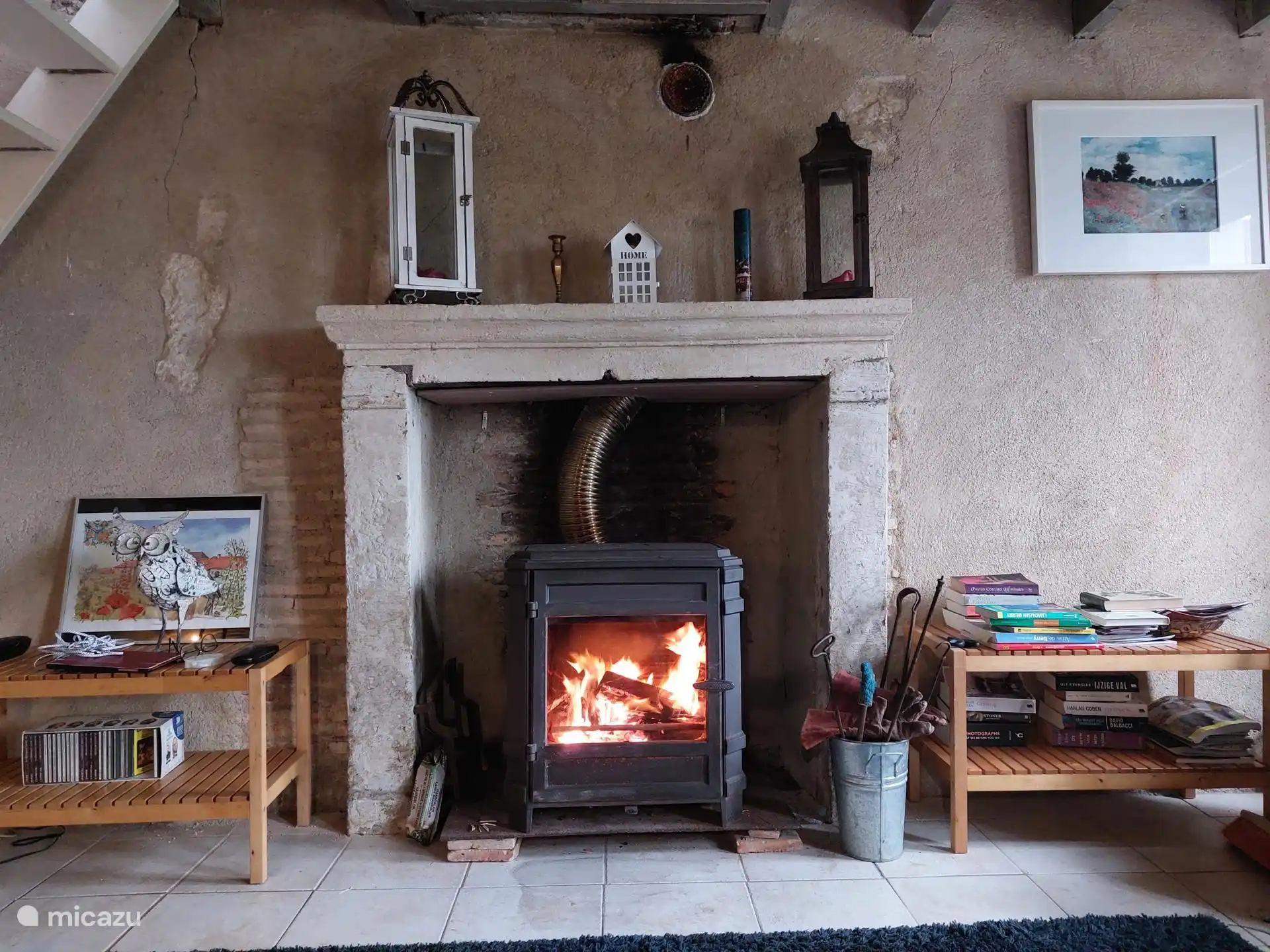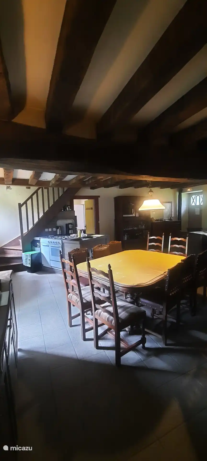 Beim Eintreten: im Erdgeschoss befindet sich eine Sitzecke mit gemütlichem Holzofen, eine Küche mit Kühlschrank und großem Gasherd plus Backofen, eine Essecke und ein Geschirrschrank. Über eine offene Treppe gelangt man in den ersten Stock. Diese Etage ist geräumig und es gibt ein Doppelbett und einen Schrank, in dem Bettdecken und Kissen zu finden sind, auch für das Schlafsofa im Erdgeschoss, praktisch, wenn Sie Gäste haben. Das Badezimmer befindet sich ebenfalls im ersten Stock mit Duschkabine, Waschbecken und WC.