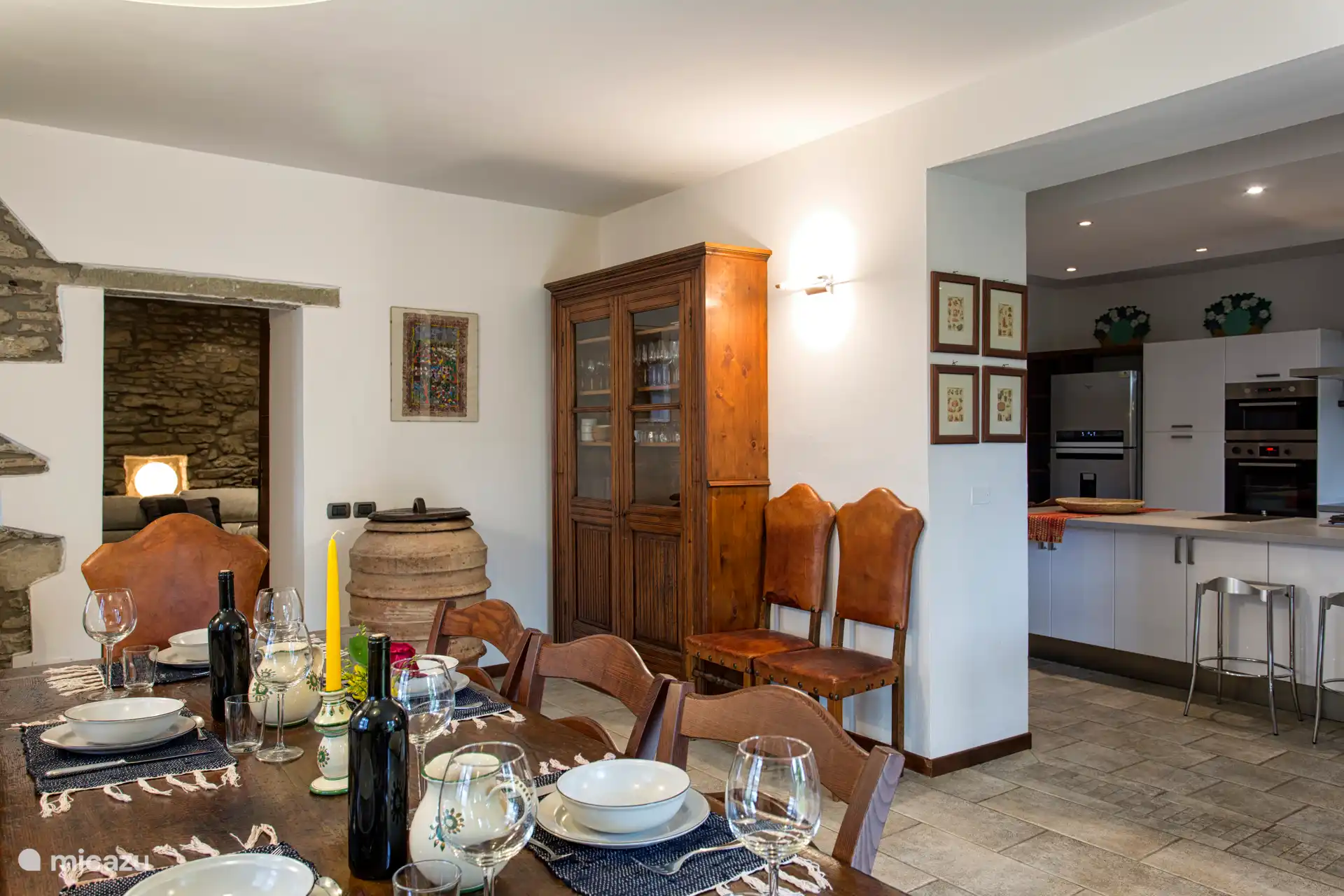 Rechts vom Eingang befindet sich der Wohnbereich, der aus einem Steinkamin, einem Sofa und Sesseln, einem großen Esstisch und einem Smart-TV besteht. Vom Wohnzimmer aus hat man direkt Zugang zur Küche durch eine Salo-Tür. Die Küche ist modern und geräumig, vollständig ausgestattet und mit allem ausgestattet, was Sie brauchen, um Ihre Lieblingsgerichte zuzubereiten, und sie ist direkt mit der Außenveranda verbunden, wo Sie große Bereiche zum Entspannen und Essen zur Verfügung haben. Von der Veranda aus betreten Sie einen Raum, der als Waschraum genutzt wird, komplett mit Waschmaschine und Trockner.