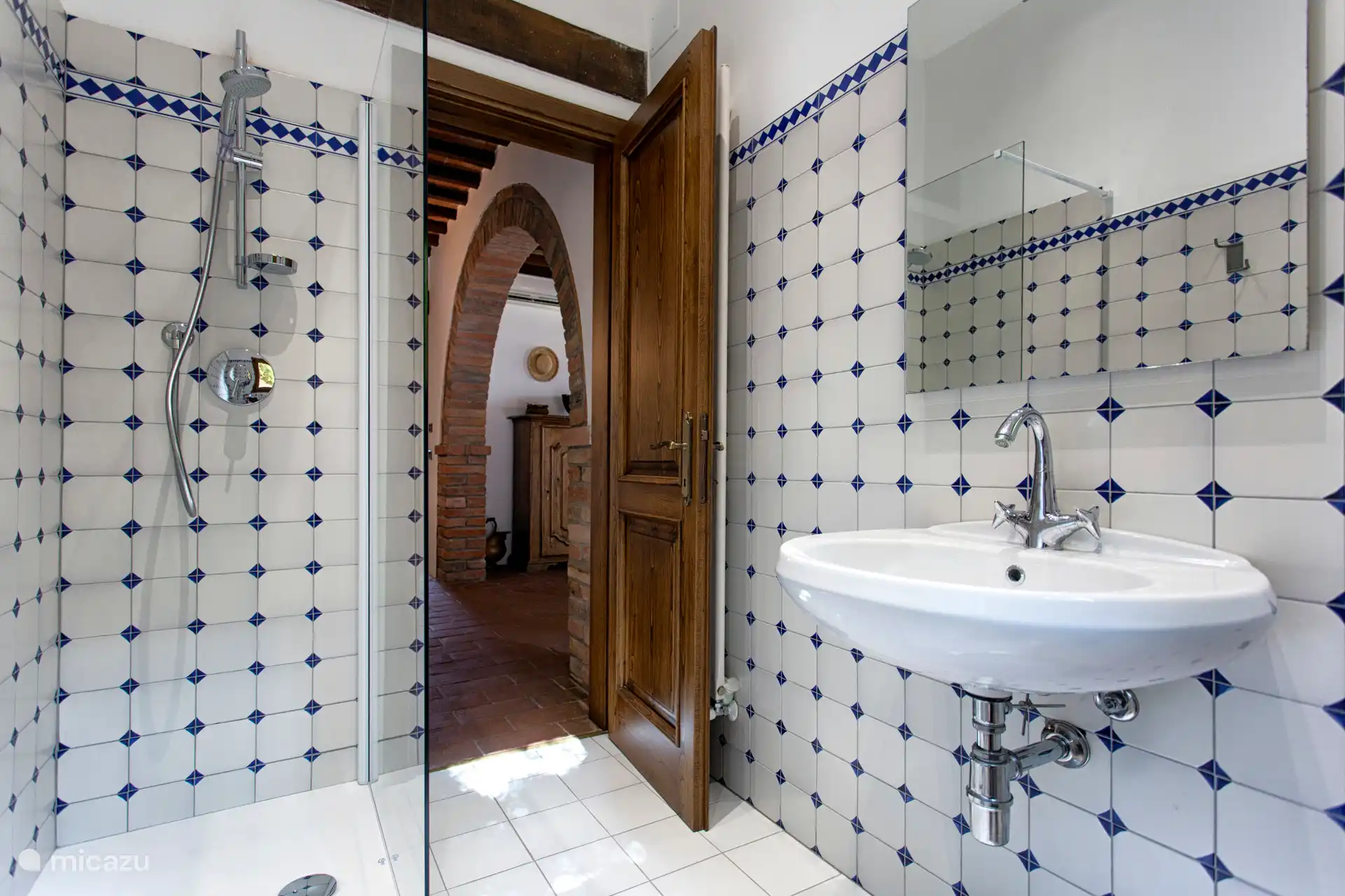 - Ein Badezimmer mit Dusche auf dem Treppenabsatz.