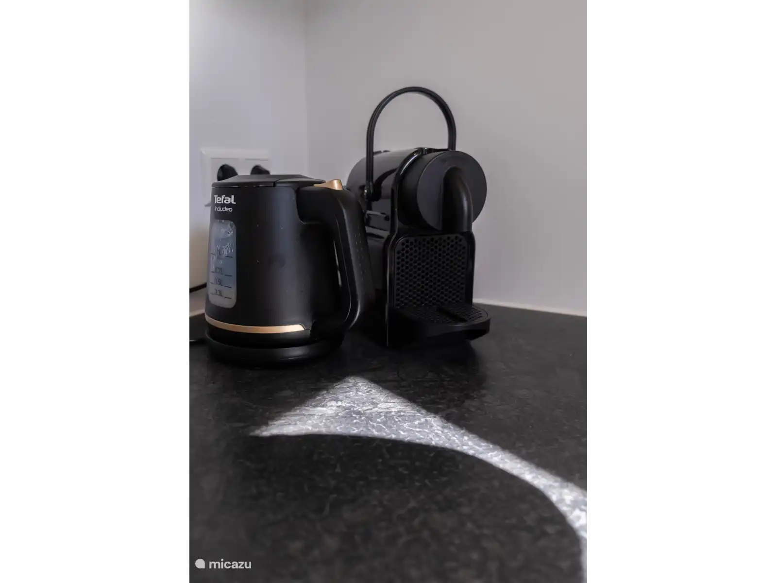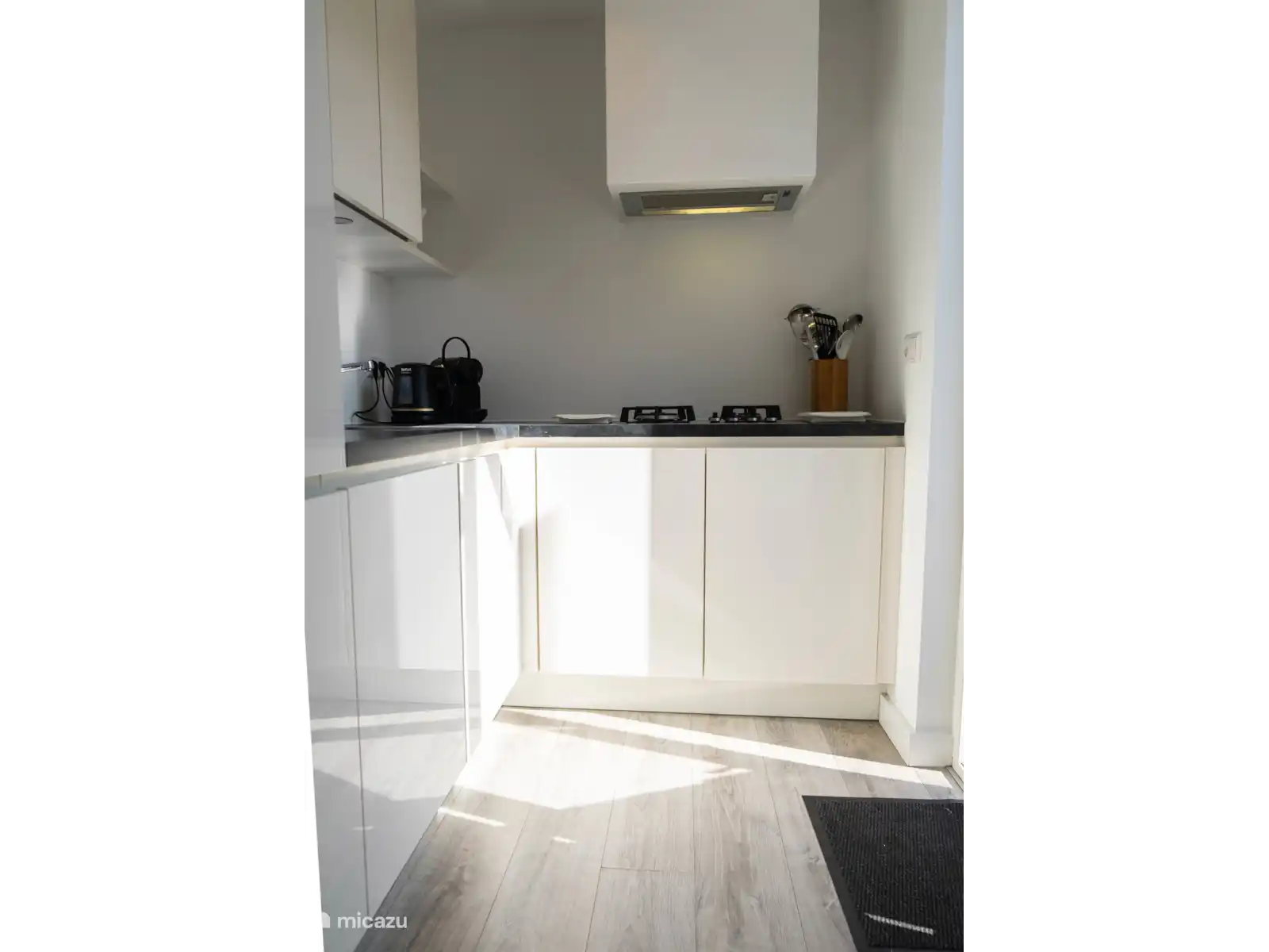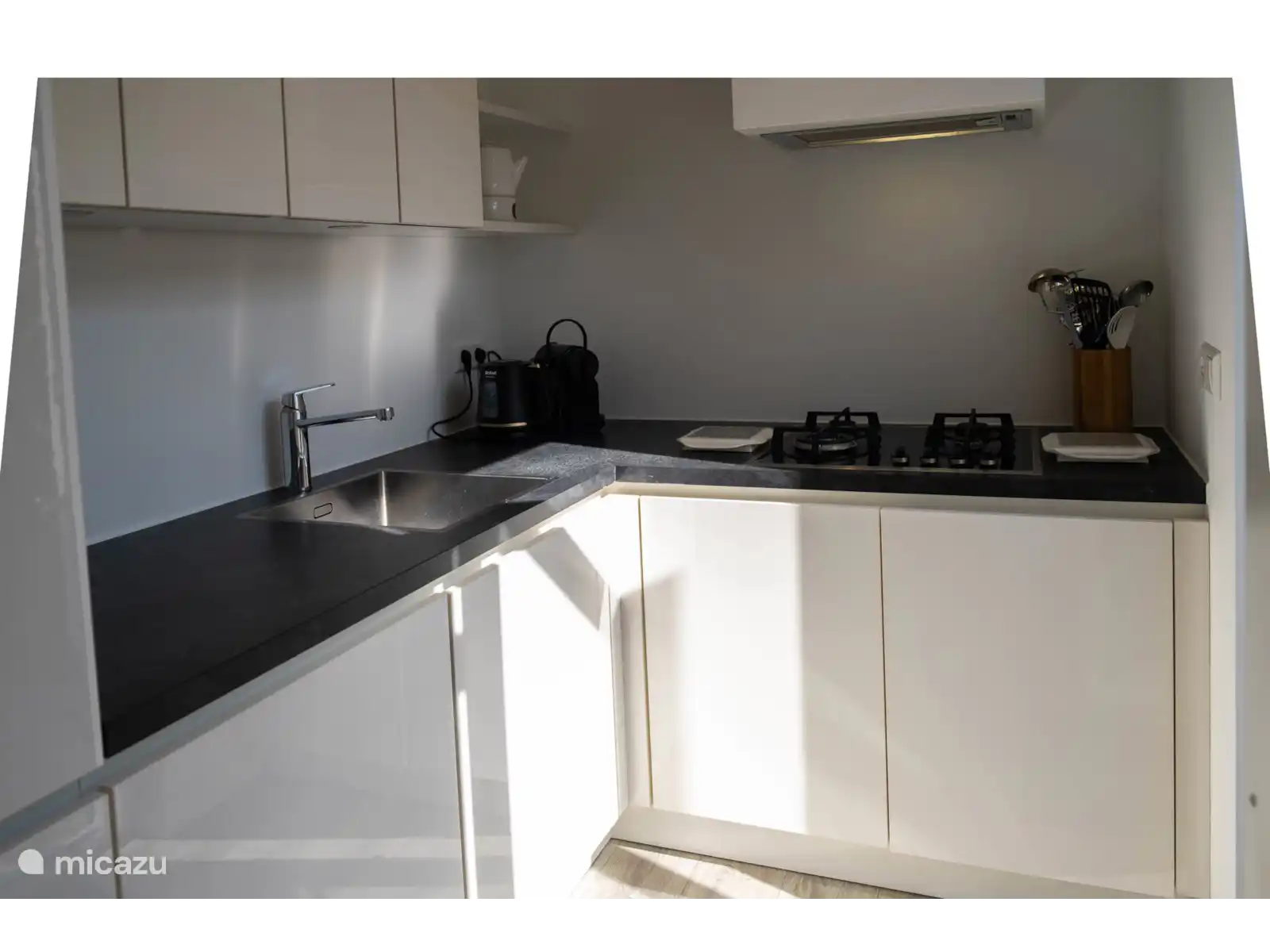 Küche: Die offene Küche ist komplett ausgestattet mit Kühlschrank, Herd, Mikrowelle, Kaffeemaschine und allen notwendigen Utensilien, um eine köstliche Mahlzeit zuzubereiten.