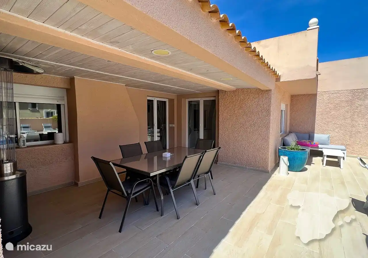 Der Essbereich, der sich praktischerweise neben der Küche befindet, geht mühelos in den gemütlichen Loungebereich über, in dem ein Plüschsofa und ein Smart-TV den perfekten Rahmen zum Entspannen bieten. Von hier aus gelangen Sie auf den geräumigen Balkon von 28 m² mit einem überdachten Essbereich und einem stilvollen Lounge-Set. Es ist der ideale Ort, um Ihren Morgenkaffee bei Sonnenaufgang zu genießen oder sich abends bei einem Drink zu entspannen, während Sie den mediterranen Sonnenuntergang beobachten.