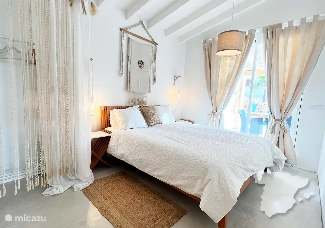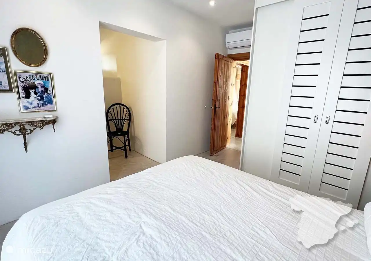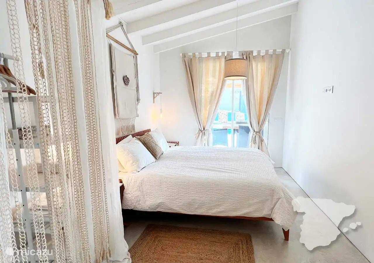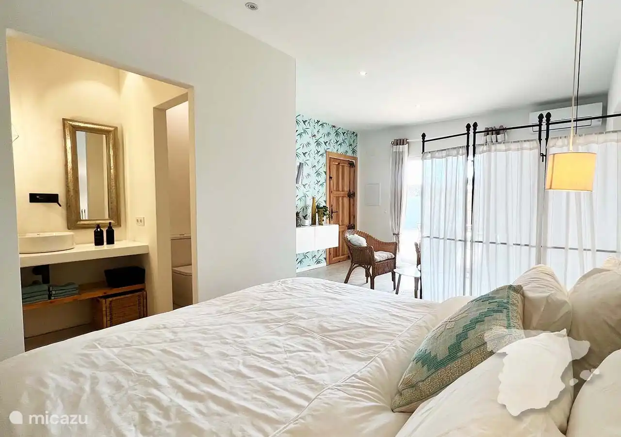 Die anderen beiden Schlafzimmer und das Badezimmer grenzen an das Haus an, sind aber über die überdachte Terrasse zu erreichen. Das moderne Hauptschlafzimmer verfügt über ein Doppelbett, einen Kleiderschrank im Ibiza-Stil, eine Klimaanlage und ein eigenes Bad. In diesem Badezimmer finden Sie eine geräumige begehbare Dusche, WC und Waschbecken. Angrenzend an dieses Schlafzimmer finden Sie ein weiteres Zimmer mit einem Sofa. Dies ist ein Schlafsofa, das für zwei Personen geeignet ist.