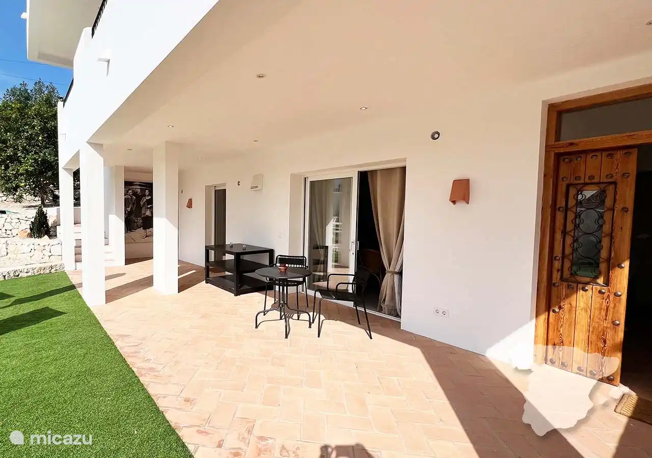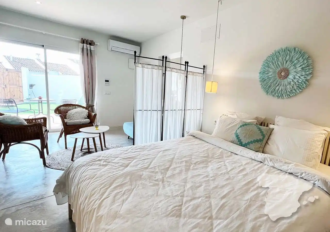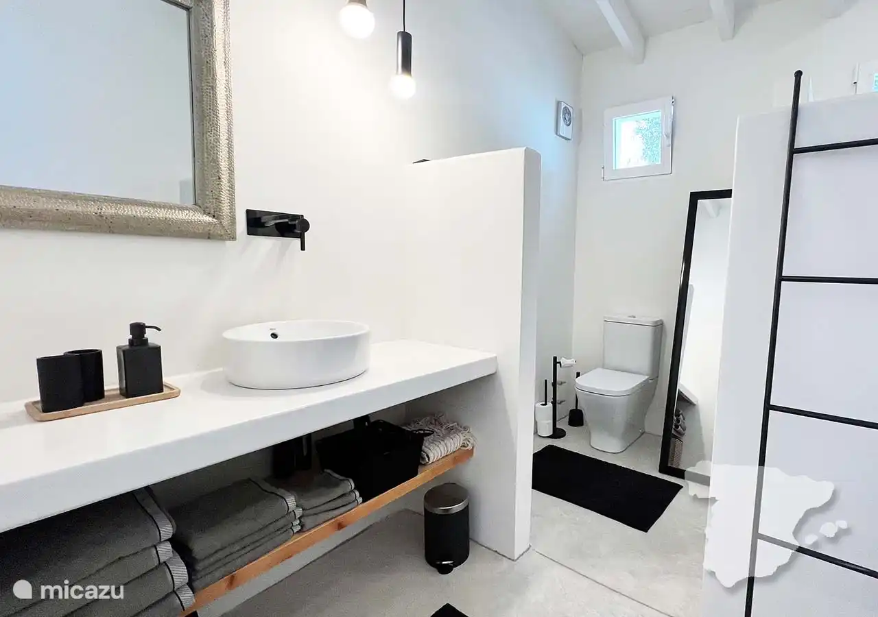 Die anderen beiden Schlafzimmer und das Badezimmer grenzen an das Haus an, sind aber über die überdachte Terrasse zu erreichen. Das moderne Hauptschlafzimmer verfügt über ein Doppelbett, einen Kleiderschrank im Ibiza-Stil, eine Klimaanlage und ein eigenes Bad. In diesem Badezimmer finden Sie eine geräumige begehbare Dusche, WC und Waschbecken. Angrenzend an dieses Schlafzimmer finden Sie ein weiteres Zimmer mit einem Sofa. Dies ist ein Schlafsofa, das für zwei Personen geeignet ist.