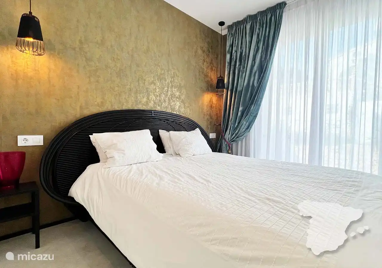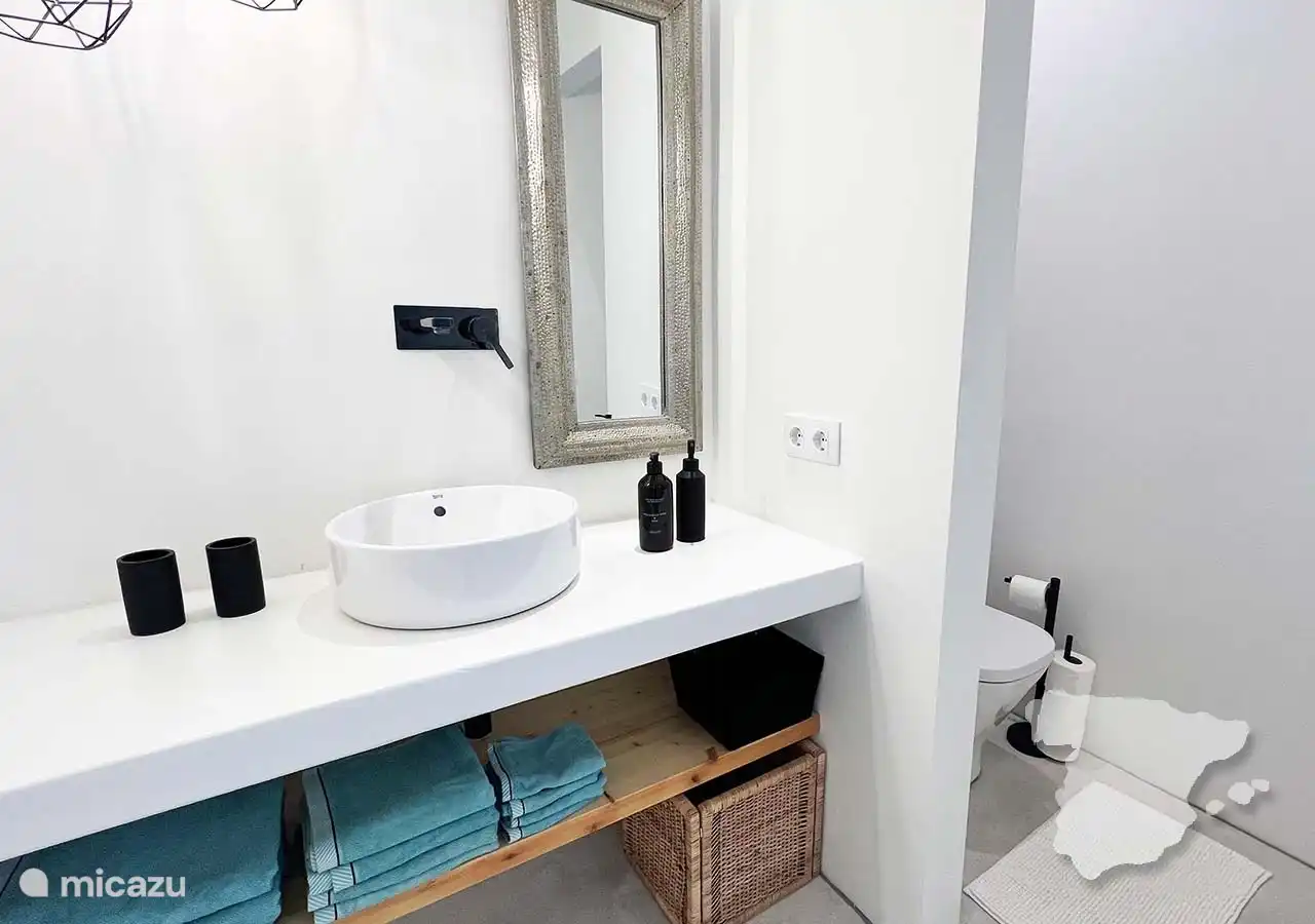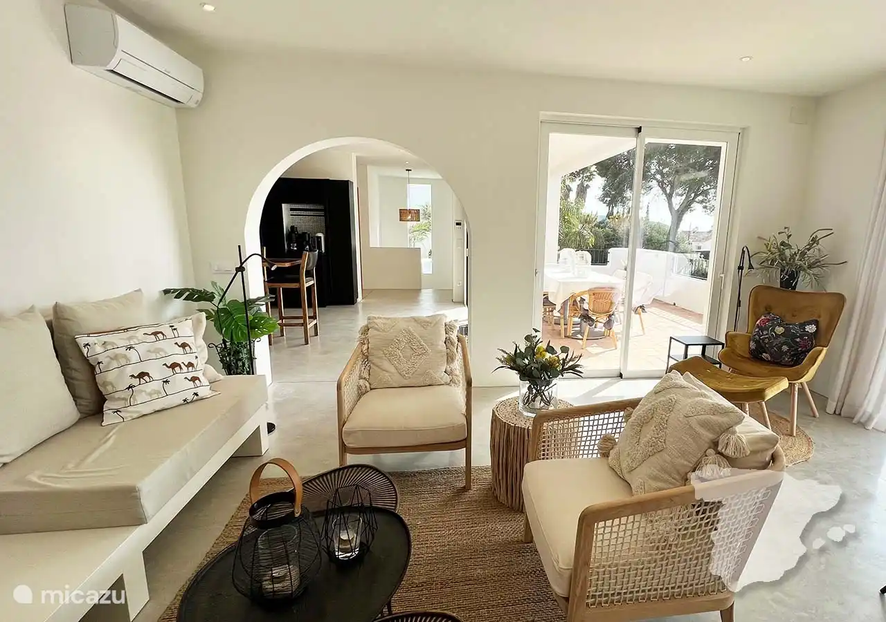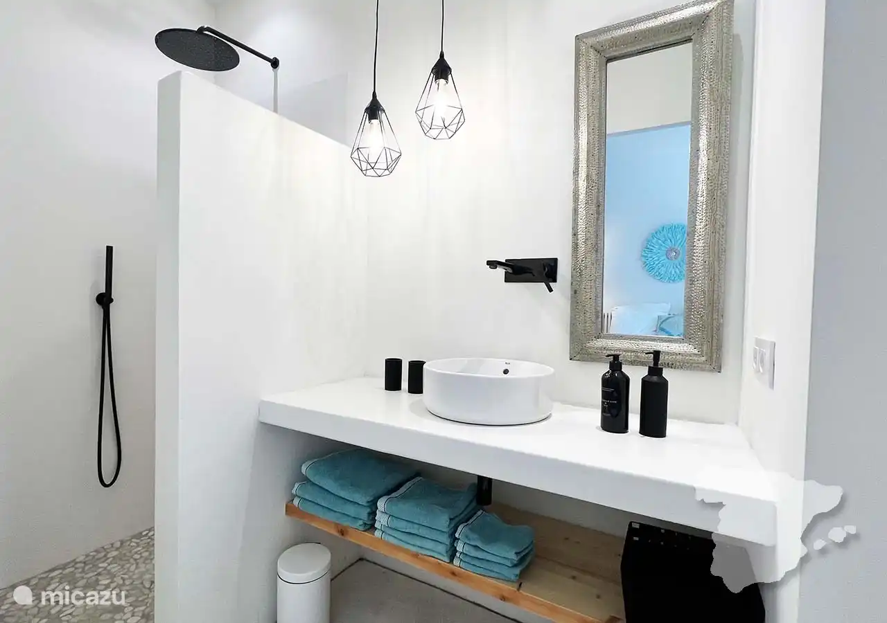 Die anderen beiden Schlafzimmer und das Badezimmer grenzen an das Haus an, sind aber über die überdachte Terrasse zu erreichen. Das moderne Hauptschlafzimmer verfügt über ein Doppelbett, einen Kleiderschrank im Ibiza-Stil, eine Klimaanlage und ein eigenes Bad. In diesem Badezimmer finden Sie eine geräumige begehbare Dusche, WC und Waschbecken. Angrenzend an dieses Schlafzimmer finden Sie ein weiteres Zimmer mit einem Sofa. Dies ist ein Schlafsofa, das für zwei Personen geeignet ist.