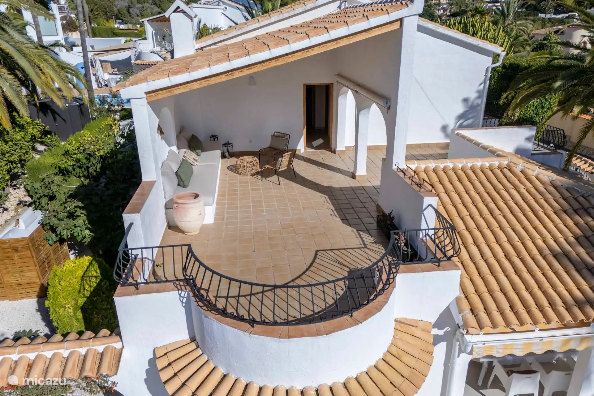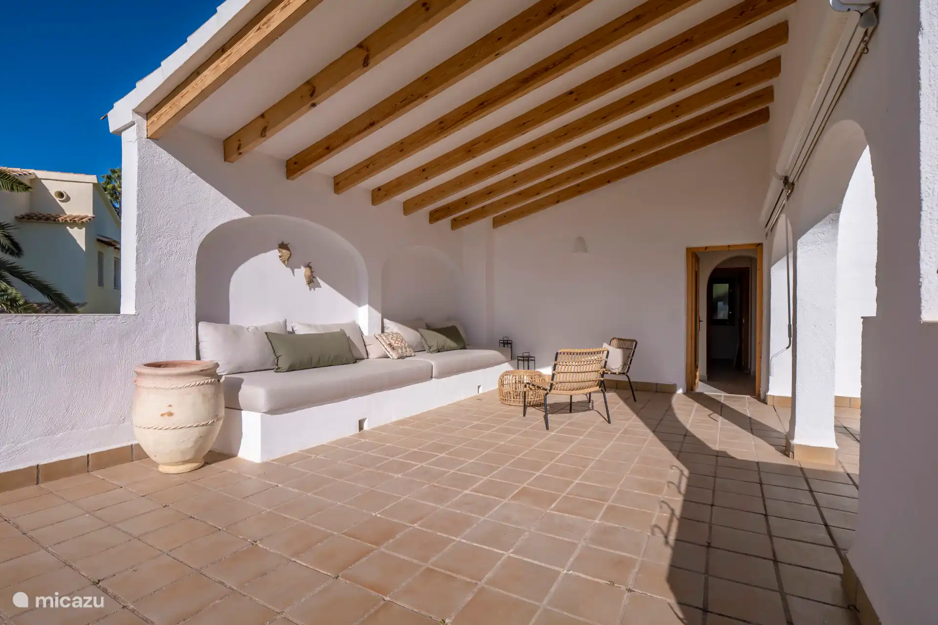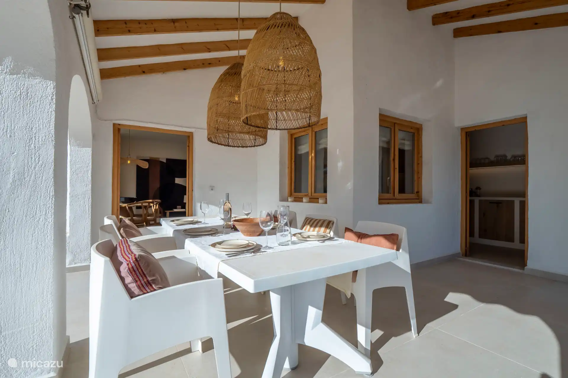 Auf der überdachten Terrasse, der Naya, können Sie den Schatten und die kühle Meeresbrise genießen. Hier befindet sich der große Esstisch für 8 Personen und ein Eck-Lounge-Sofa. Da die Küche von Casa Shanti mit einer großen Schiebetür ausgestattet ist, angrenzend an die Naya mit dem großen Esstisch, befindet sich auch der (Gas-)Grill, so dass Sie draußen und drinnen mit Blick auf den Garten kochen können.