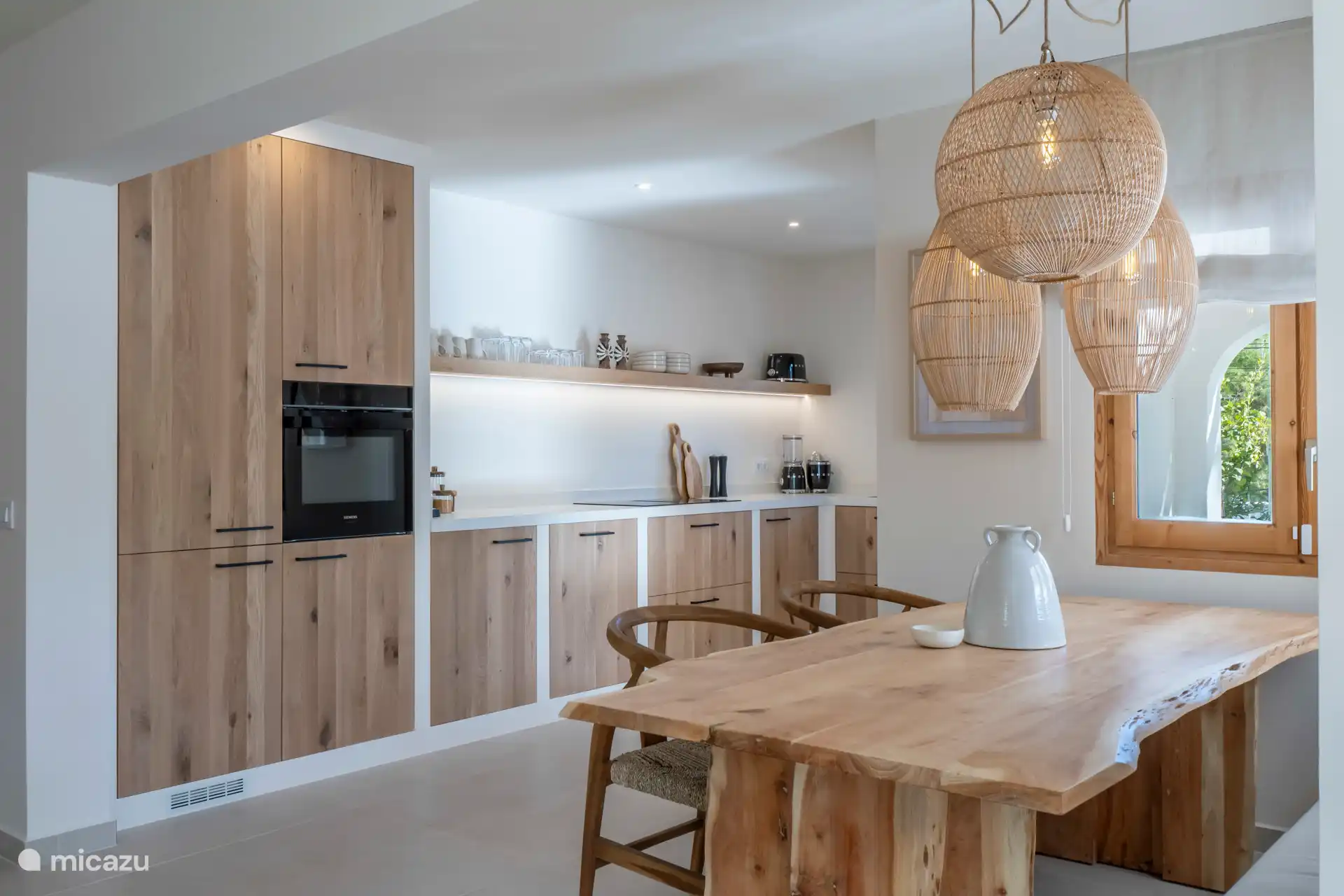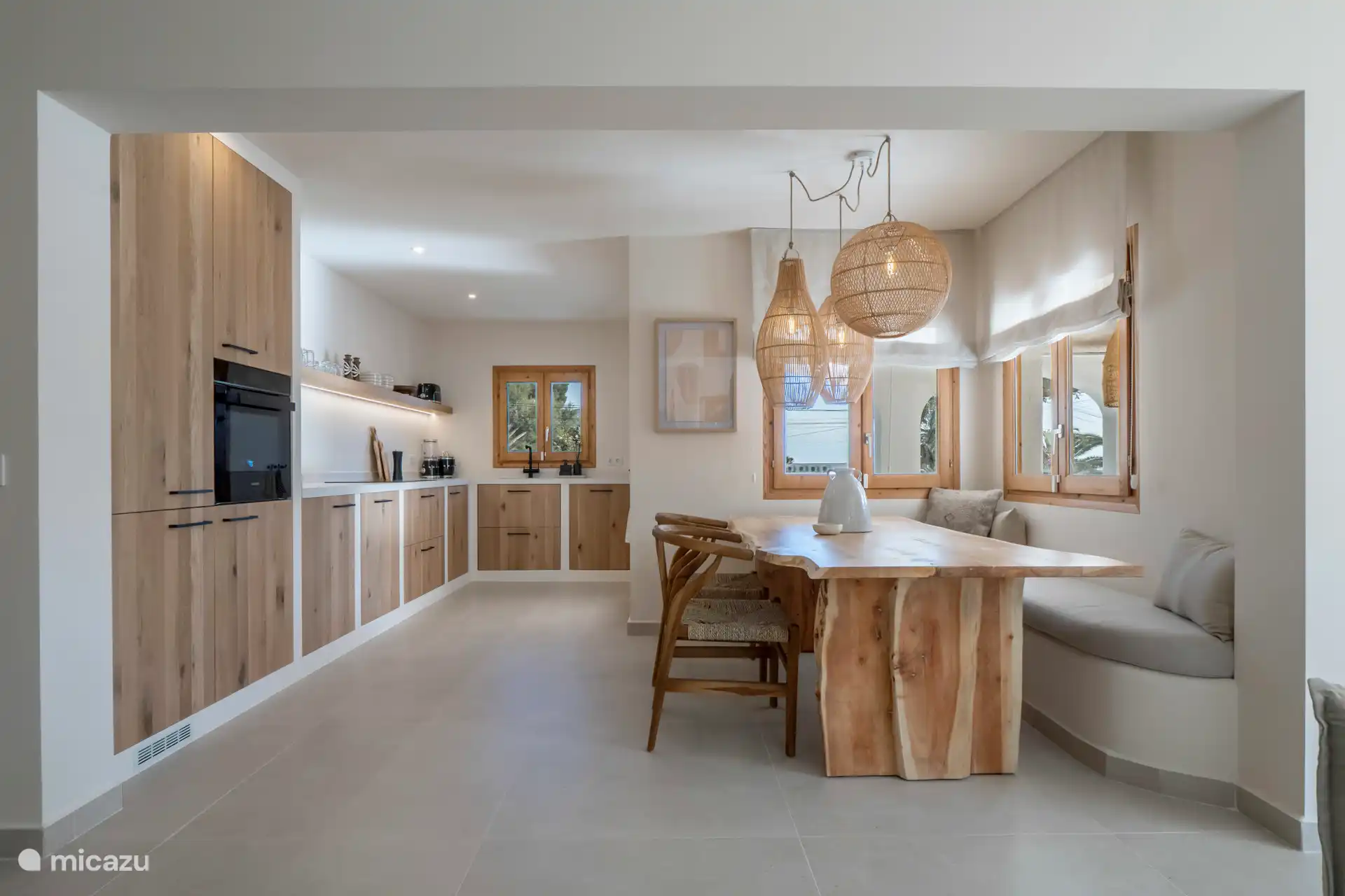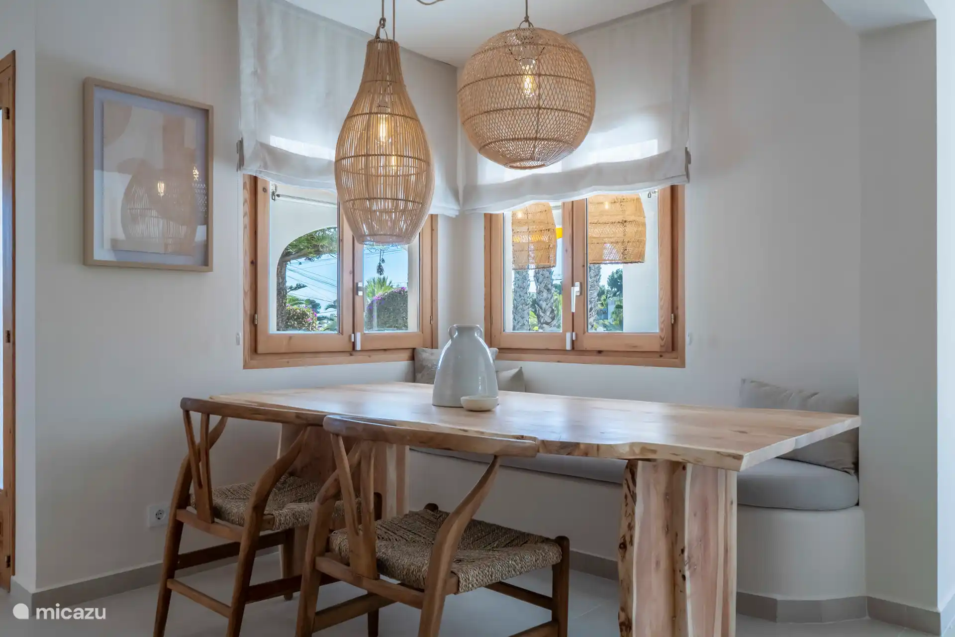 Auf der überdachten Terrasse, der Naya, können Sie den Schatten und die kühle Meeresbrise genießen. Hier befindet sich der große Esstisch für 8 Personen und ein Eck-Lounge-Sofa. Da die Küche von Casa Shanti mit einer großen Schiebetür ausgestattet ist, angrenzend an die Naya mit dem großen Esstisch, befindet sich auch der (Gas-)Grill, so dass Sie draußen und drinnen mit Blick auf den Garten kochen können.