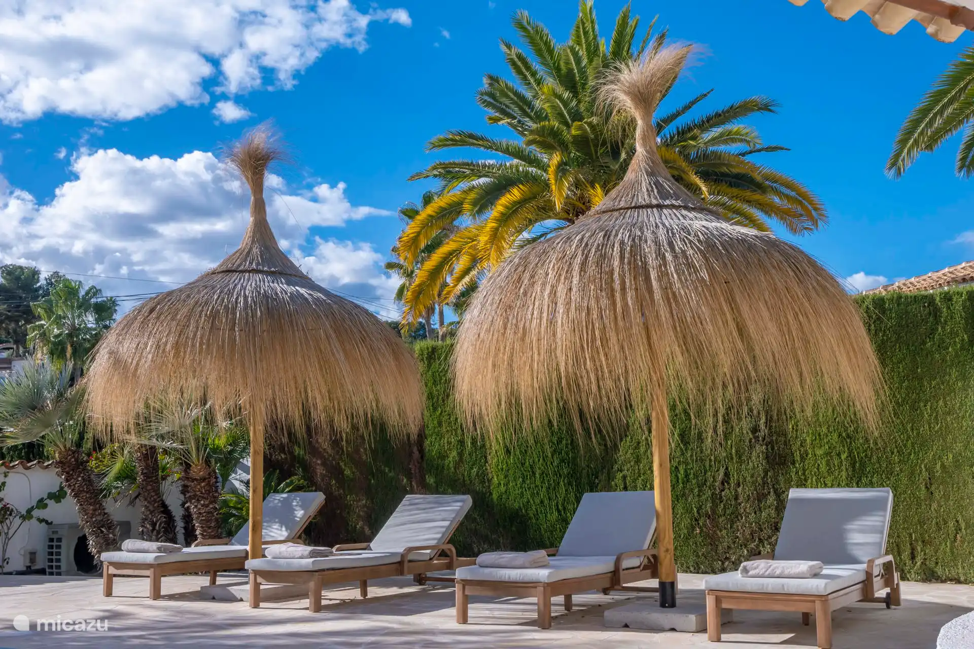 Außen:Im Garten befindet sich der 8×4 Meter lange Swimmingpool und die Außendusche. Im Garten gibt es mehrere Plätze zum Entspannen sowohl in der Sonne als auch im Schatten. Verschiedene Sonnenliegen, Sonnenschirme und Sitzgelegenheiten stehen zur Verfügung.