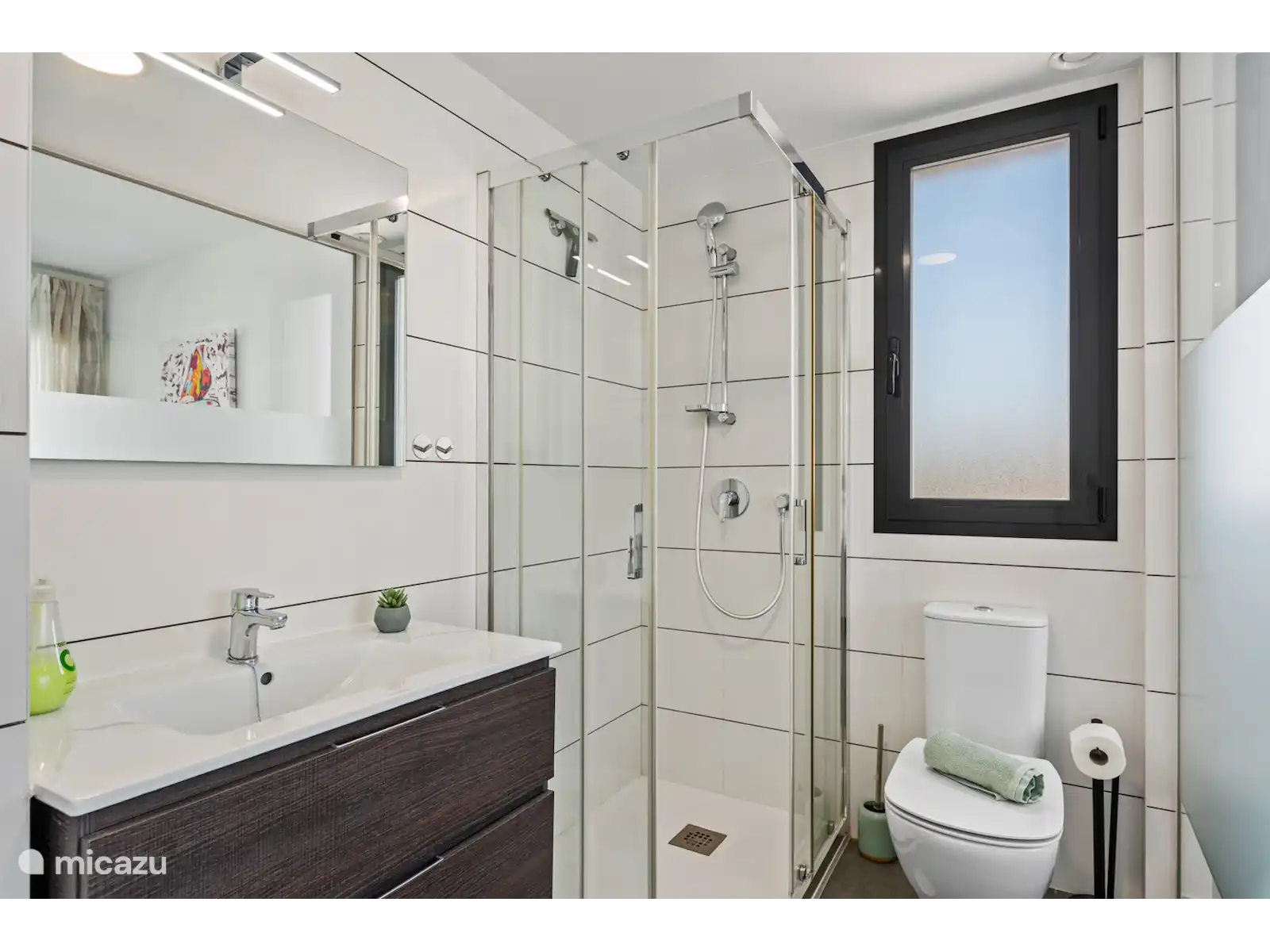 - Badezimmer mit Einzelwaschbecken, Dusche und WC